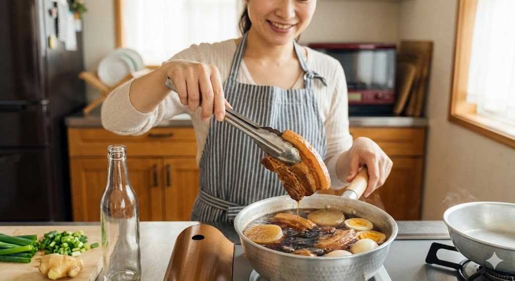 - 醤油(大さじ3〜4)、生姜スライス(数枚)を加え、落とし蓋をして弱火でコトコト40分〜1時間煮込みます。